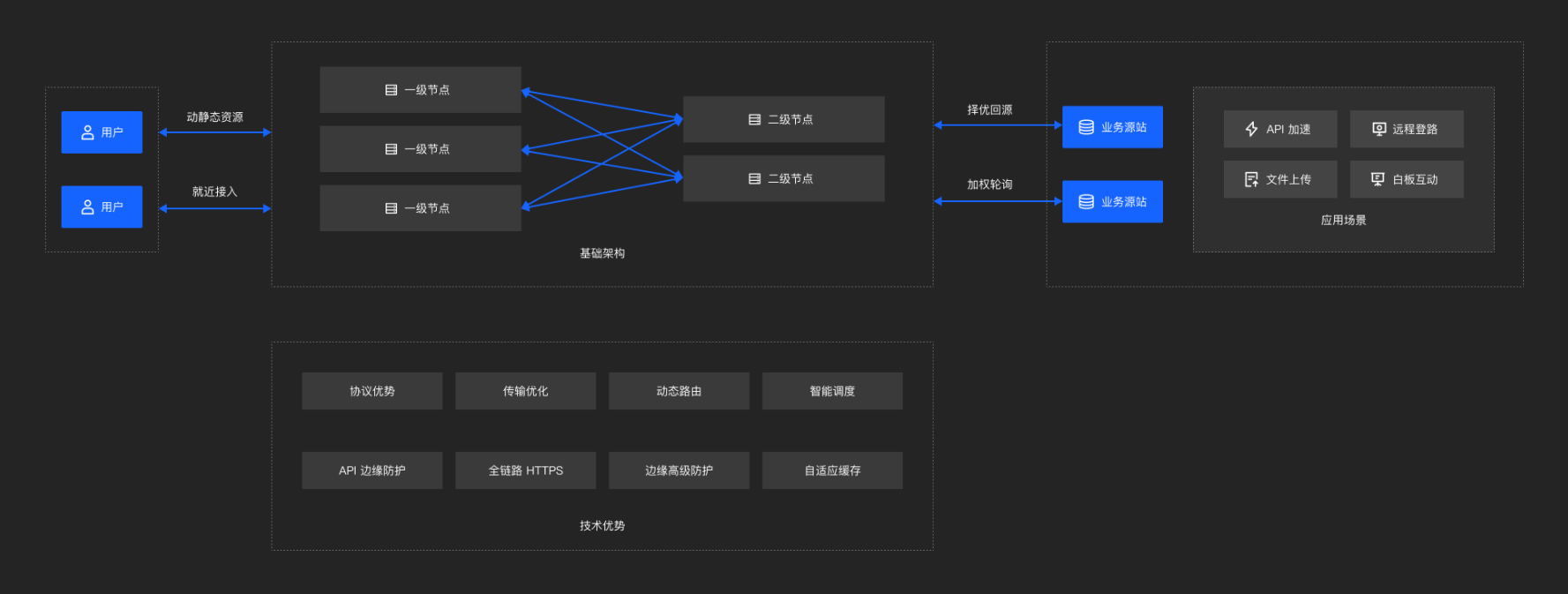 智能云 全球加速网络采用边缘节点、区域中心两级架构,通过节点间智能路由与专项路径优化,进一步提升加速效果。可有效解决跨国回源链路质量不佳与回源慢的问题,改善跨国访问质量。